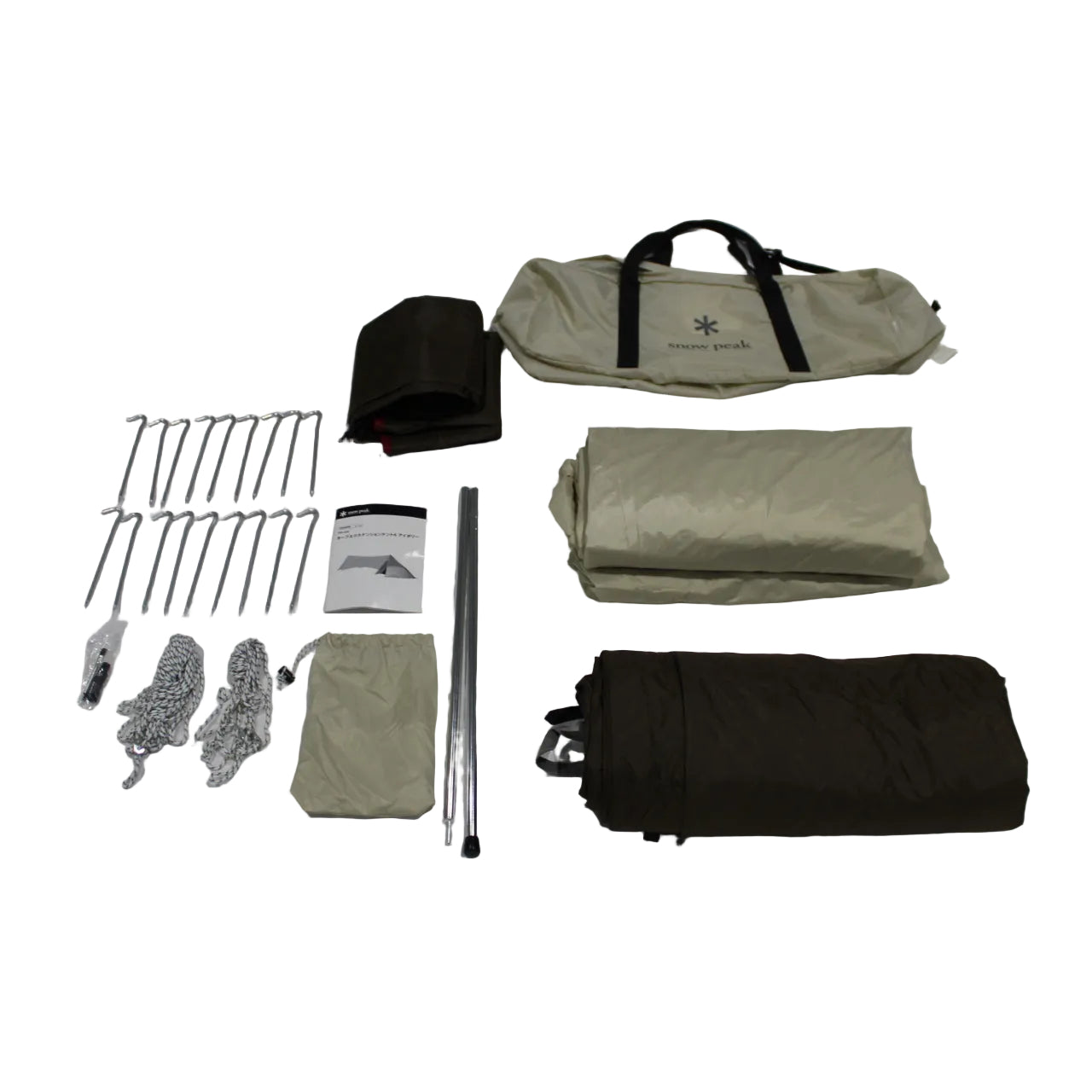 セット内容 フライシート、インナーテント、グランドシート、サブポール(×1)、自在付ロープ(二又10m×1、二又5m×1、2.5m×6)、キャリーバッグ、ジュラルミンペグ(×18)、ペグケース、シームグリップ剤