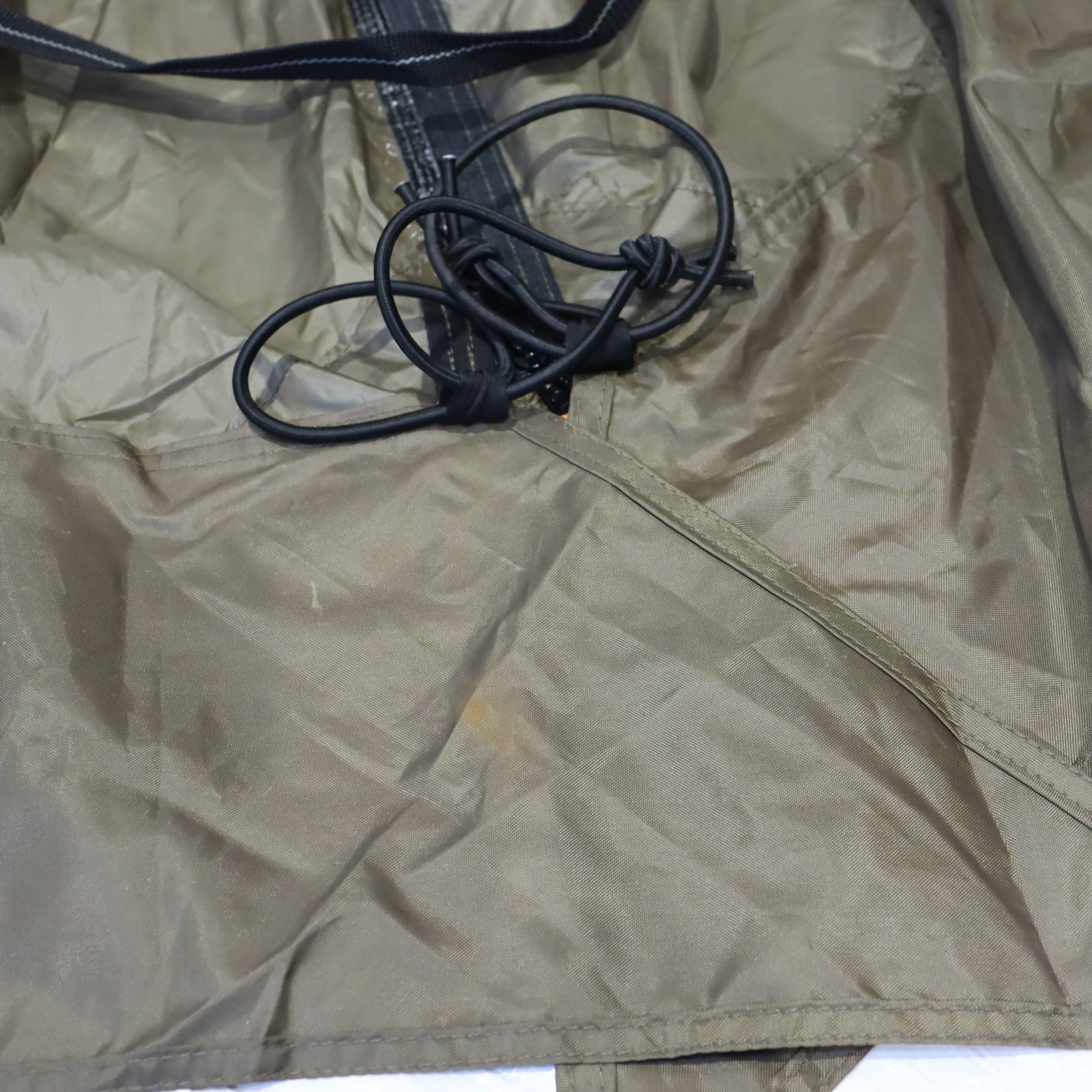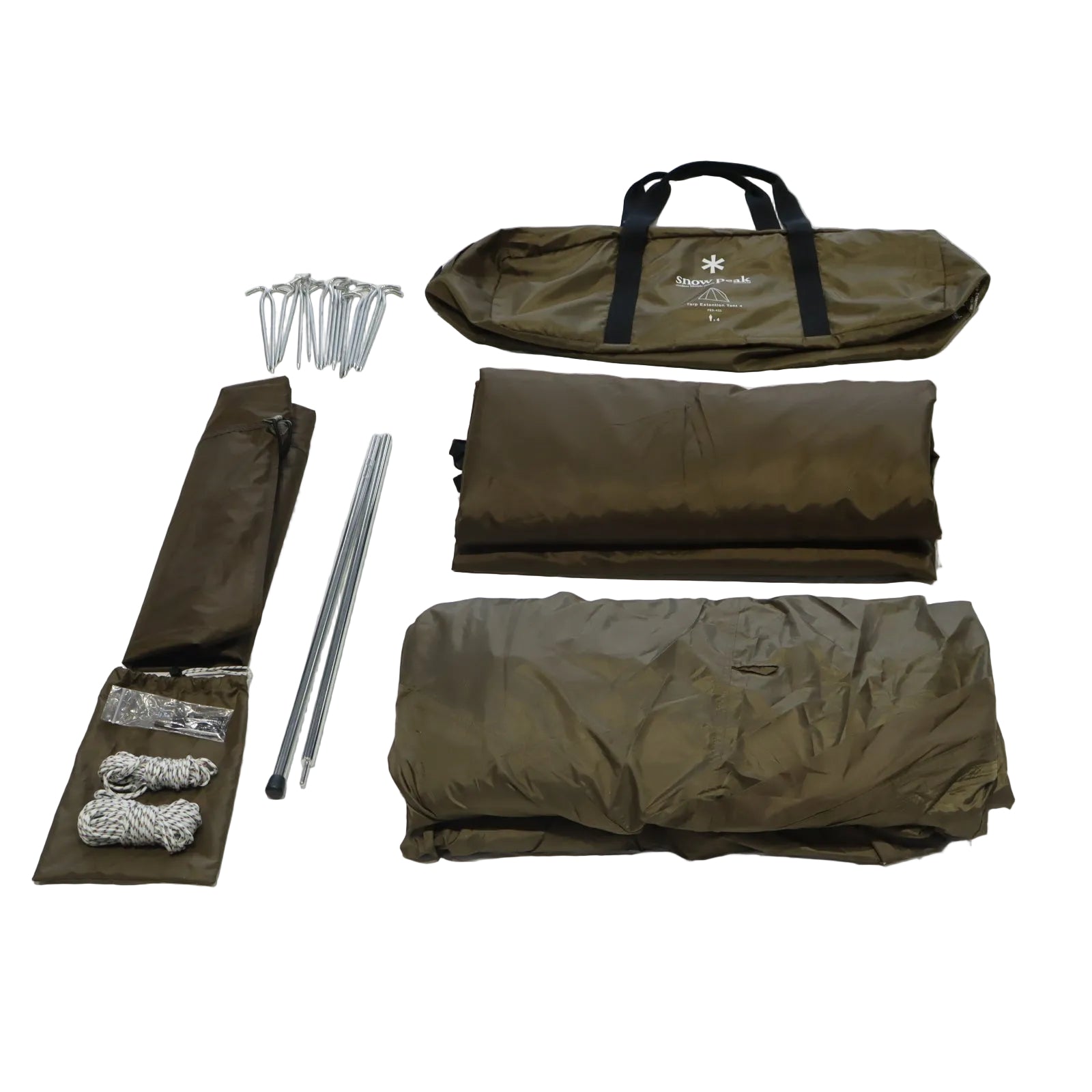 軽度な使用感あり / フライシートに目立つ汚れなし / スカートに使用に伴う汚れあり / グランドシートに落としきれない土汚れあり / ※タープ無しで使用する場合でも別途 280cm のウイングポール×1、ポール用ペグ(35cm 以上)×2 が必要になります