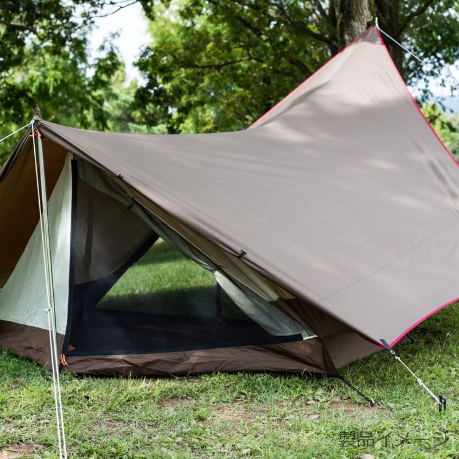 一人の時間を贅沢に過ごす、ソロキャンパーのための快適ソロテント。キッチン・リビングとして必要十分な前室スペースと、既存のソロテントに劣らない屋内空間。長さの違う2本のポールを前後に配置することにより、天井の高い、ロースタイルにぴったりの前室空間を創出しました。チェアやテーブル、その他のキャンプギアも、ゆとりをもって配置が可能です。タープは変形六角形にすることで、後方部分にも雨避けの役割を果たしてくれる後室ができ、後方からの出入りも可能に。インナーテントは2点でフライシートに吊り下げて、コーナーを固定するだけで設営完了。後方のポールによって室内高が保たれ、大人一人が過ごすのに快適な広さに設計しました。フルパネル/フルメッシュにアレンジ可能で、多様な天候に対応。収納サイズはコンパクトに抑え、コンパクトカーやバイクへの積載もラクラク。さらにタープは単体でも使用可能です。ひとりの時間をより豊かに。ソロキャンプの楽しみの幅をより大きく広げてくれます。